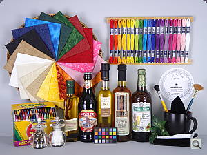 We were actually surprised when we constructed this scene just how dark the velvet and sides of the beer bottles come out on a camera. Even with the bright studio lights shining directly on it, the velvet in particular stays way, way down at the shadow end of the tone curve. With most cameras and on most monitors, the velvet will simply appear as an unrelieved swatch of black. To see whether it contains deep detail or not, in most cases you’ll have to open the file in an image editor and boost the brightness dramatically, to bring the detail up into a visible range. - Preservation of “Shape” in Strong Colors: As you approach the extremes of a camera’s color gamut (its range of recordable colors), it becomes more and more difficult for the camera to show fine gradations of tone, because one or more of the RGB color channels are close to saturation. It’s not uncommon to see a brightly colored piece of clothing or a vibrant flower appear in digicam photos as just a blob of color, because the camera ran up against the limits of its color gamut. The brightly colored embroidery threads in the upper right portion of the Still Life target are good examples of situations where this might happen. Pay particular attention to the bright red and dark blue colors here, as these are both colors near the edge of the typical sRGB color gamut.