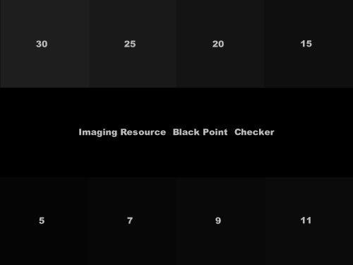 In a dimly-lit room, an excellent monitor would let you see the boundary between the central row and the “5” block. A good monitor may not go that far, but should let you see the difference between the “15” block and pure black. Many monitors may only show separation in the 30 block, and quite a few may show no blocks at all. If you can’t visually separate at least the “20” and preferably the “15” block from the background, your monitor needs adjustment and calibration. (Do note here though, that room lighting can have a very pronounced effect on how far you can see into the shadows. You may want to adjust your room lighting before you decide that your monitor has shadow problems.)