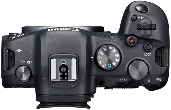 | The top of the EOS R6 includes a notable difference when compared to the EOS R5: A traditional mode dial. The R5 instead opts for a similar mode selection input as the EOS R. |
