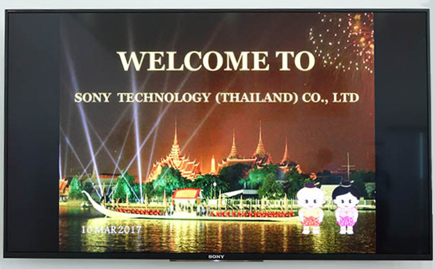 As always, we received a warm welcome at the entrance, this time displayed on a TV. (Sony, of course.) The official name for the operating division we were visiting is Sony Technology (Thailand) Co., Ltd., and the factory is located in the Chonburi area of Thailand, approximately 60-90 minutes drive outside of Bangkok.