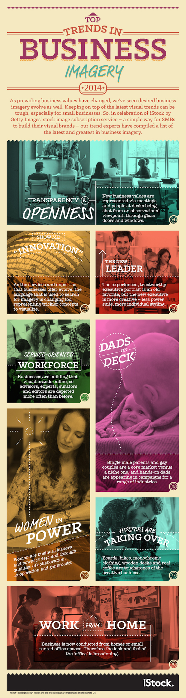 Curious about the key trends to look out for? In a few words, the experts at iStock predict an expanding market for images of involved fathers, powerful women and hipsters sitting at authentic wooden desks sipping real coffee in their home offices, all with the themes of transparency, openness, and innovation in the 21st century.